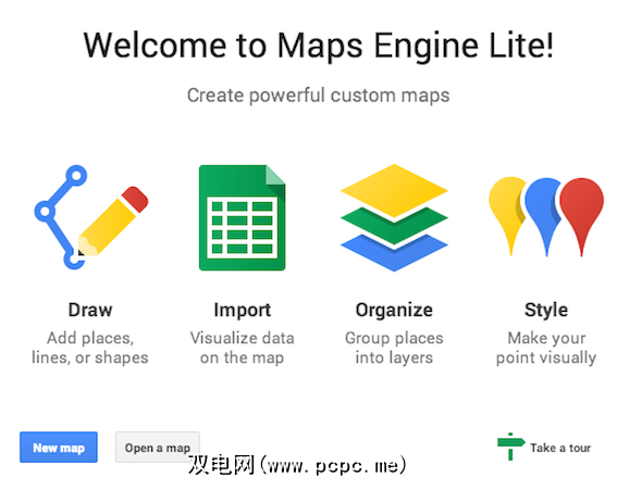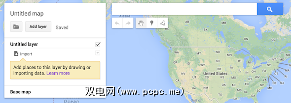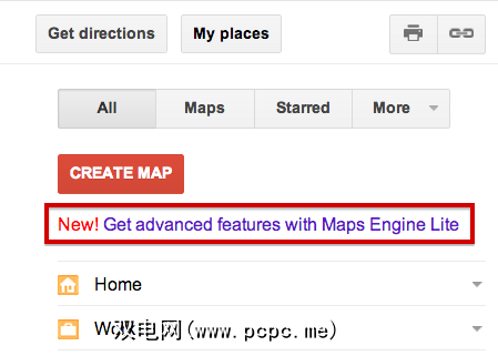 这将打开侧边栏,您可以在其中添加位置到地图。但是,为了创建具有多层的地图,您需要点击使用Maps Engine精简版获取高级功能。这样会打开一个包含新地图的新窗口。