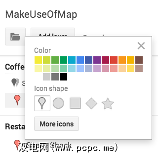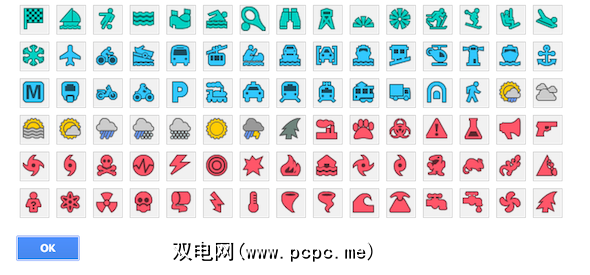 一目了然,您可以选择常规地图图钉,圆形,正方形,菱形和星形。单击“更多图标"按钮将打开许多其他选项: