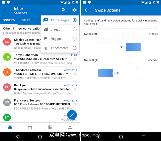 这些其他应用大多将滑动功能限制为删除,存档或计划,而Boxer可让您从11个功能中进行选择并分配向他们显示四个轻扫手势(左右滑动一遍)。