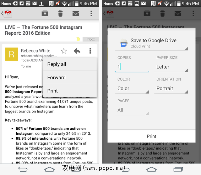 在Android上安装了此应用后,将电子邮件保存为PDF就像从中选择“ 打印"一样简单选项菜单,然后选择“ 保存到Google云端硬盘"作为输出选项。