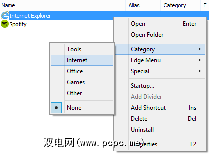 从主菜单中,您可以分配应在自定义工具栏或边缘菜单中显示的应用程序。右键单击一个应用程序,然后选择相应的目的地。您可以通过 Properties (属性)选项添加自定义类别。
