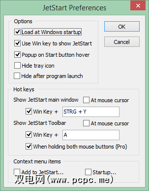 默认情况下, JetStart不会向“开始"按钮添加功能。可以通过主窗口管理设置。默认的键盘快捷键是 Windows键+ S ,但是在Windows 8上已经使用。您可以在首选项中将快捷方式更改为另一个组合键。一定要为JetStart工具栏设置一个方便的快捷方式!您还可以分配Windows键来显示JetStart。