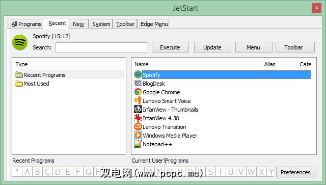 JetStart是“开始"菜单的替代方法,与Windows扩展坞(如RocketDock或StarDock的ObjectDock)有些相似;不太时尚,但更高级。它的主要卖点是可以快速浏览和搜索应用程序的主窗口,带有可配置类别的工具栏,最多四个用于停靠应用程序的边缘菜单以及一次启动多个程序。