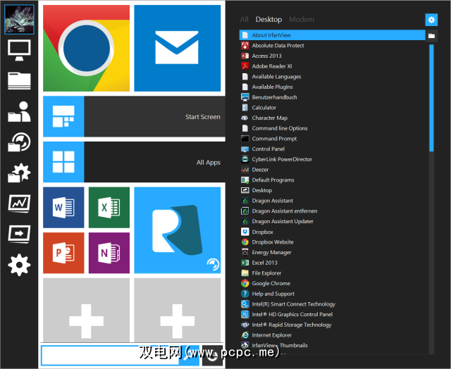基于图块的“开始菜单"齐磊器最接近Windows 10中的“开始"菜单。左列提供了关键系统功能的快捷方式,包括计算机和个人文件夹,控制面板,任务管理器以及“运行"菜单。左侧的第二列为您最经常使用的应用程序提供了空间。单击“所有应用程序"图块或在“开始"菜单中从左向右移动鼠标时,将显示所有已安装应用程序的列表。