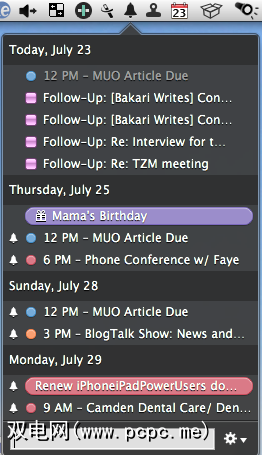 BusyCal也可以从菜单中访问条,这是“日历"仍不可用的功能。菜单栏视图列出了您即将举行的预定活动,待办事项和会议,并提供了一个文本框,用于快速添加事件。您可以简单地输入例如“ 明天与Kate开会,上午9点",BusyCal将为您设置事件。