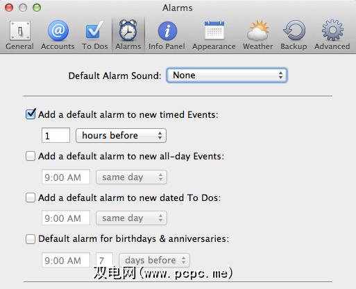BusyCal的偏好设置提供了日历中不可用的高级设置。例如,您可以使用更多选项来设置定时事件,全天事件,dos,生日和纪念日的默认警报。