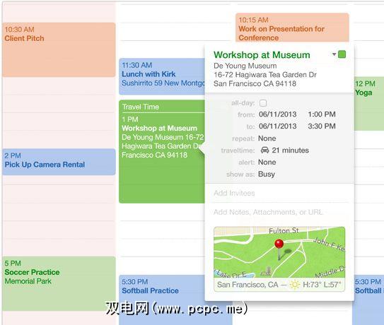 BusyCal 2.5(现已提供公开Beta版)也将提供Exchange支持,包括任务,日历共享和安排会议。 Mavericks日历的更新将包括BusyCal中不可用的功能,最值得注意的是与GPS地图信息集成(请参见下图。)