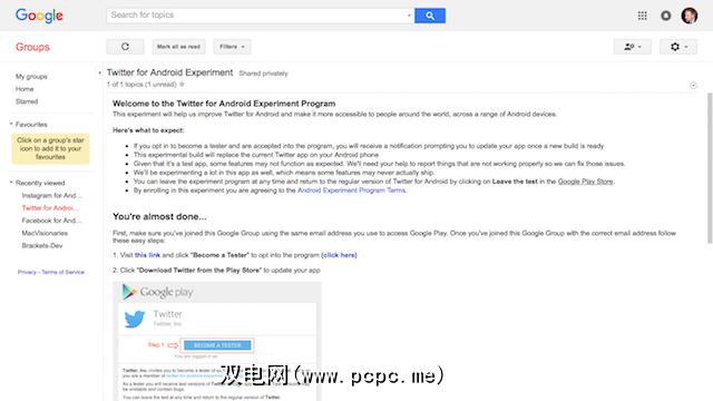 通常,您会通过以下方式获得此链接:加入该应用程序的Google+社区或Google网上论坛(Twitter beta仍需要此信息)。在某些情况下,例如Spotify Beta版,您甚至可能需要事先获得批准才能加入该小组。