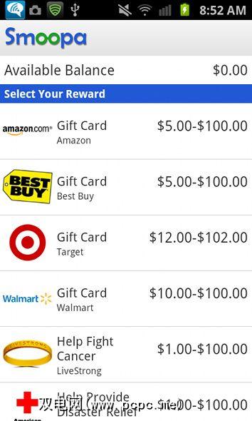 Smoopa确实为您的所有努力提供了一些不错的奖励。您可以从几种不同的礼品卡中进行选择,通过邮件获得支票或将奖励余额捐赠给慈善机构。选择什么完全取决于您,但是在任何情况下都将向您付款!就个人而言,我希望他们也可以通过PayPal向人们付款,因为它既快速又安全,但是我现在将其保留在我的愿望清单中。