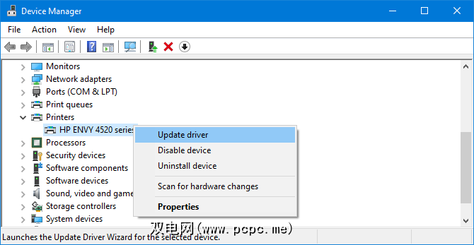 为此,请按 Windows键+ X >,然后选择设备管理器。在新窗口中,双击打印机类别。 右键单击打印机,然后单击更新驱动程序。