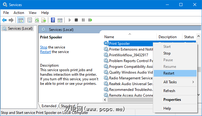 打开“开始"菜单,搜索服务,然后打开相关的应用程序。向下滚动,直到在名称列中看到后台打印程序。找到它后,右键单击,然后单击重新启动。