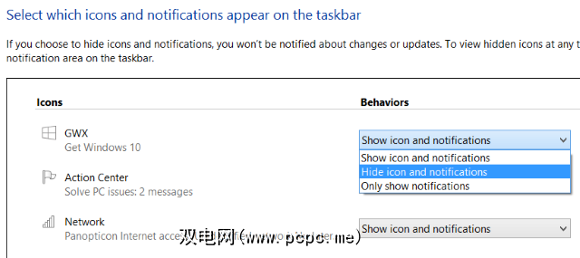 管理GWX(获取Windows 10)通知最简单的方法是将其隐藏,您可以通过右键单击时钟附近的系统托盘,然后选择自定义通知来进行隐藏图标。在出现的屏幕中,找到GWX,并将行为设置更改为隐藏图标和通知。