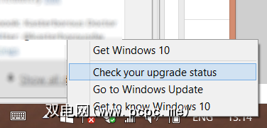 如果碰巧的是,您没有看到Windows 10升级通知,它将首先在系统任务栏中显示为Windows徽标。右键单击它,您可以查看获取Windows 10 弹出窗口,或检查升级状态,但是如果您继续忽略它,它将开始自动弹出。