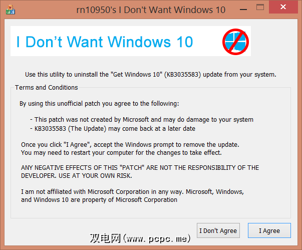它可以通过自动从Microsoft删除KB3035583更新来起作用,因此实际上是先前修复的“干净"版本。下载 I_Dont_Want_Windows_10.zip 文件后,解压缩内容并运行我不要Windows 10.exe 。该实用程序将警告您一些事情(例如,它不是Microsoft补丁,并且您需要自担风险),并且您需要单击“我同意"以继续。