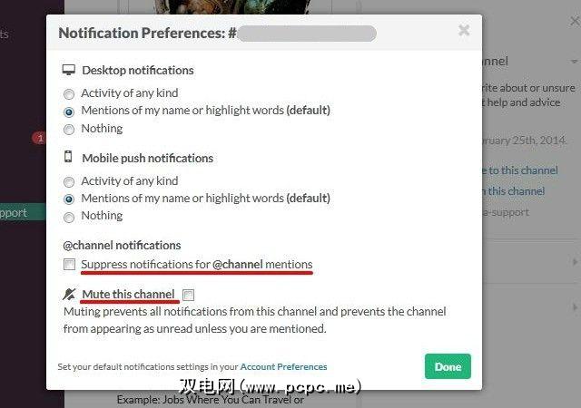 覆盖默认通知设置以使通知静音并取消特定频道的@channel提及。要访问这些设置,请首先单击频道名称(在其消息窗口中)。然后从显示的下拉列表中选择频道通知首选项。
