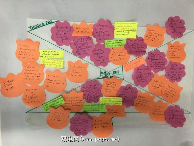 All that information is then condensed and organized in the format that the team can understand and build on. The simplest tool for doing this is post-its. Sometimes the information is arranged in stages, sometimes the entire journey of the customer or the process is mapped. Laying out information in this way is helpful to figure out the pain points, who the end users are, and things like that.