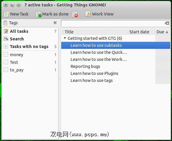 Getting Things Gnome排在第三位,但几乎可以抢走第二名。当涉及可用的任务选项和组织工具时,此小应用程序的功能极为强大。它提供了前两个选项所缺少的某些功能,例如标签。实际上,关于GTG的一件很酷的事情是,您可以使用'@'在任务的描述中添加标签。