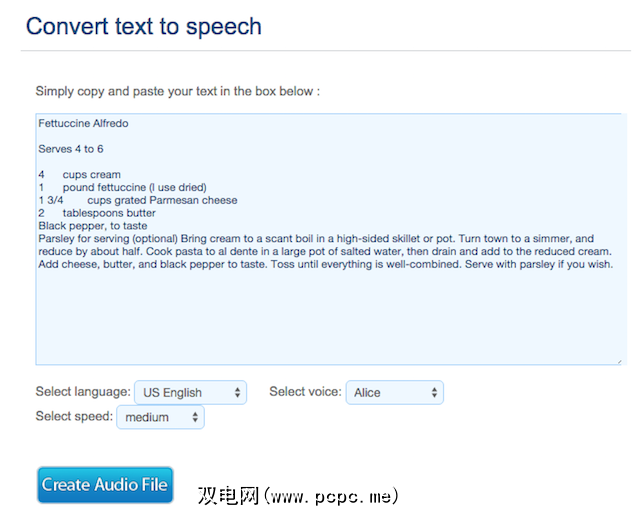 选择要保存到配方播放列表的配方后,转到TextToSpeech将说明转换为mp3文件。将配料及其数量和食谱说明粘贴到网站上,然后单击``创建音频文件''。
