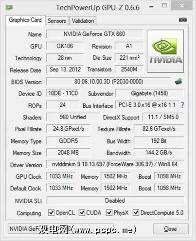 GPU-Z的默认选项卡可以是一开始有点令人生畏,尤其是这是您首次涉足GPU相关指标时。一直到BIOS版本,前几个字段都与GPU的制造属性有关。它叫什么,版本号是什么,甚至物理裸片的大小是多少,以及它包含多少个晶体管。