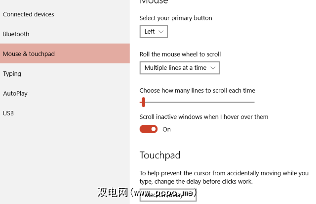 如果您的计算机配备了精密触摸板硬件,则会看到诸如 Use如上图所示,用两根手指点击以右键单击。否则,“鼠标和触摸板"设置将如下所示:
