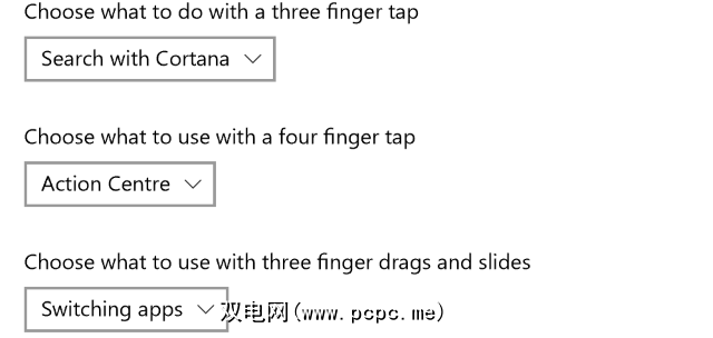 用三根手指打开可以打开一个全新的选项集合。这些手势本质上是捷径。例如,默认情况下,三指水龙头会打开Cortana。可以调整选择用三指点击的操作下拉菜单,但是,如果需要的话,可以启动“动作中心"。