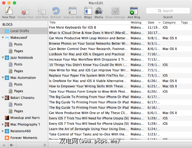 如果您要管理各种博客,则历史悠久的博客编辑器MarsEdit (39.99美元)提供对WordPress,Blogger,Tumblr,TypePad,Movable Type和其他几个程序的支持。我使用MarsEdit在这个网站上起草了大部分文章,主要是因为它的功能可以更快地嵌入URL链接,图像和标题格式。