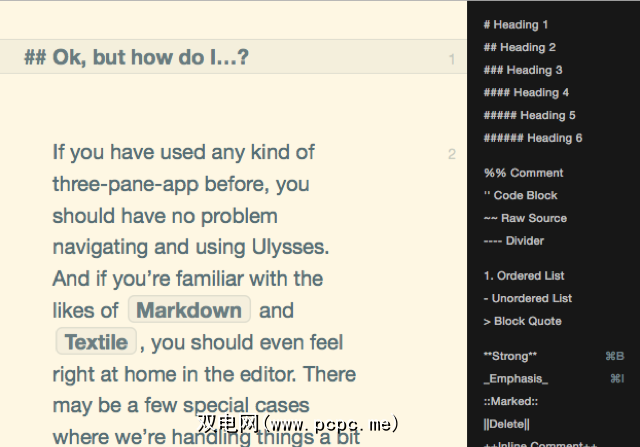 Soulmen的Ulysses III广告宣传为“流畅的书写体验" –对于许多用户来说肯定是这样。 Ulysses是一个整洁的编写环境,还提供了用于管理多个编写项目的工具。它不是桌面发布程序,但包含对Markdown的支持。 iOS版本的Ulysses即将发布,并且文档也可以与iOS应用Daedalus Touch同步。打字行停留在文档的所选顶部,中间或底部。它的两个左面板可以隐藏,该软件支持全屏模式键入。使用Ulysses,文档不会保存在Finder中,而是将它们一起保存在一个库中,通过编写项目和单独的“工作表"来组织。Ulysses库可以保存到iCloud,Dropbox或Mac Finder中的任何位置。