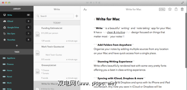 The笔记和Markdown Mac客户端Write($ 9.99)与Ulysses类似,但它允许在多个位置管理和同步文档和文件夹,包括iCloud,Dropbox和Google Drive。文件和便签也可以加标签和加注星标,并且支持Markdown。