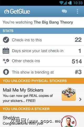 Android上的GetGlue [不再可用]是一个简洁的小应用程序。登录后,您可以签到节目,查看朋友的签到流或从指南中获取建议,查看其他在同一对话中签到相同内容的人在说什么或查看对您的回复留言中的评论。您还可以查看有哪些可用的贴纸并查看您的个人资料。