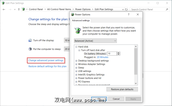 如果要进一步对其进行微调,请单击更改高级电源设置。该对话框上的选项可对与电源相关的事件进行大量的粒度控制。您可以根据硬件和软件需求定制它们。