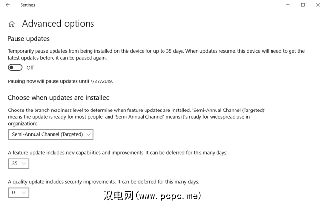 在选择何时安装更新下,您可以分别推迟安装质量更新(最多30天)和功能更新(最多一年)。此选项仅在Windows 10 Pro中可用。