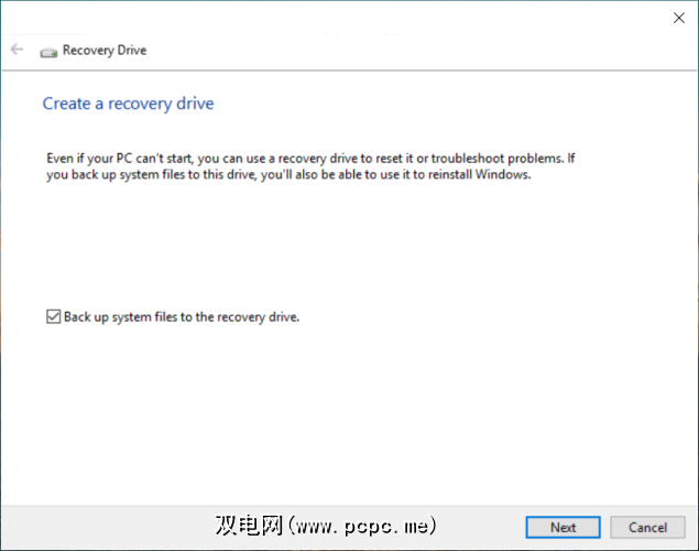要创建恢复驱动器,请在搜索框中键入“ recovery",然后选择恢复驱动器 >结果中的应用。在窗口中,选中将系统文件备份到恢复驱动器。
