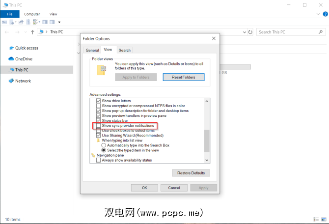 Microsoft使用文件资源管理器来宣传OneDrive存储和Microsoft Office 365服务。要停止此操作,请转到查看>选项>更改文件夹和搜索选项。在出现的“文件夹选项"窗口中,导航到查看标签,然后关闭显示同步提供程序通知。