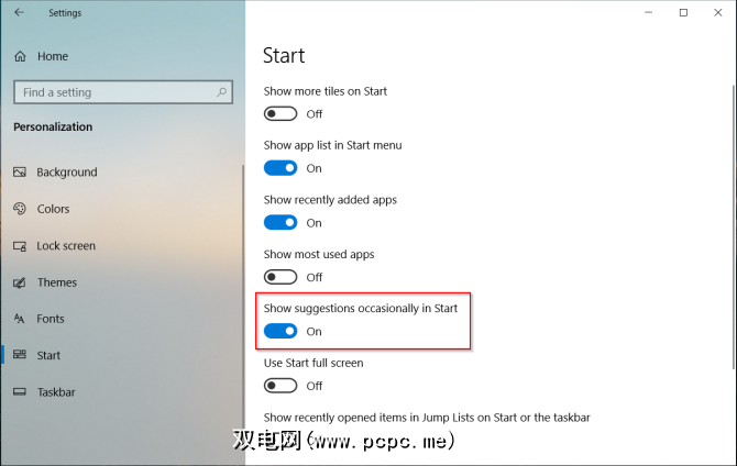 Windows 10通常会在“开始"菜单中向您显示建议的应用程序或游戏。要停止此操作,请导航至设置>个性化设置>开始,然后关闭在“开始"中偶尔显示建议。
