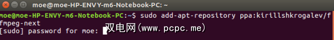 将提示您输入密码。接下来,在需要时输入密码。添加PPA后,运行更新并安装FFmpeg: