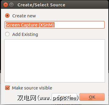 选择屏幕捕获(XSHM)。确保已选中新建。您可以为其指定一个唯一名称,也可以保持不变。如果您正在运行双屏设置,则需要从下拉菜单中选择正确的屏幕。