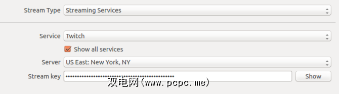 您必须先添加流源,然后才能开始流式传输。选择设置,然后导航到流。在下拉菜单中,选择流服务或其他服务。默认情况下,仅出现Twitch。但是,选中显示所有服务框会在 Service 下拉列表中填充一系列选项。从YouTube到hitbox.tv。如果您正在寻找Twitch的替代产品,Hitbox可能是您的最佳选择。
