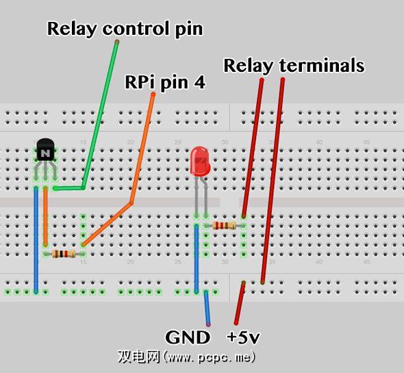 第一个命令类似于Arduino的设置功能,我们告诉Pi使用引脚4作为输出。下一条命令将值1写入该引脚,该引脚将触发晶体管,激活继电器,关闭LED电路并打开。