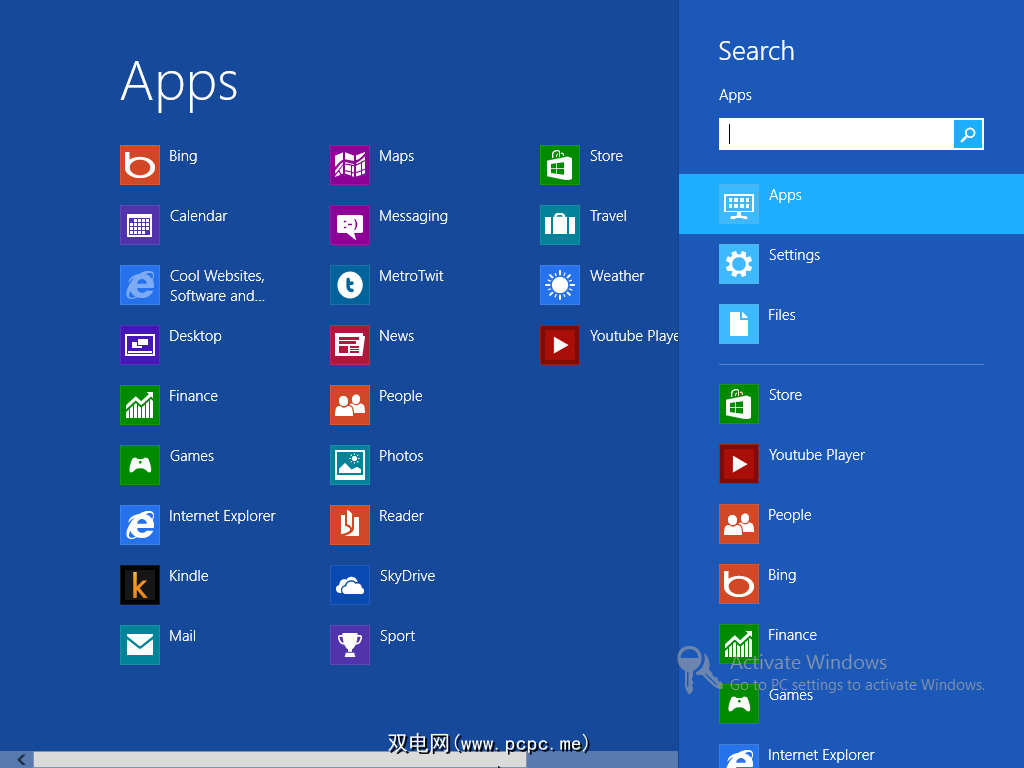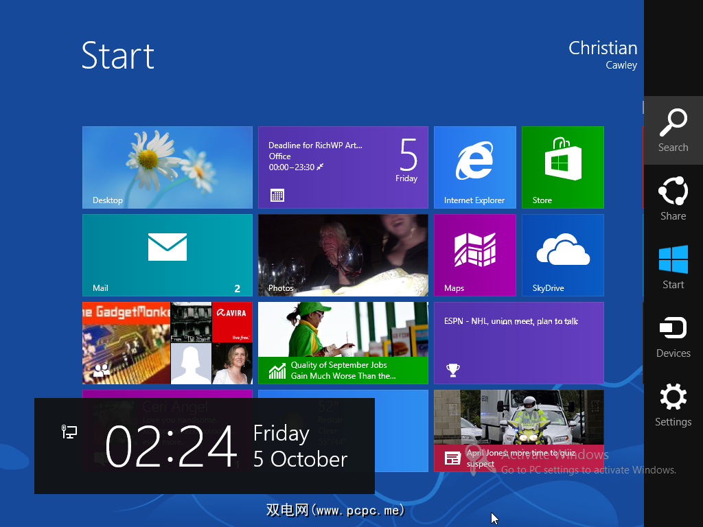 这些选项以Metro风格显示。在屏幕的左侧,还将显示日期,时间,电池和无线网络信息。