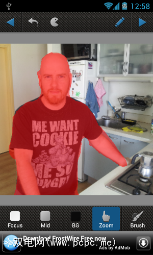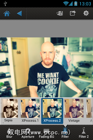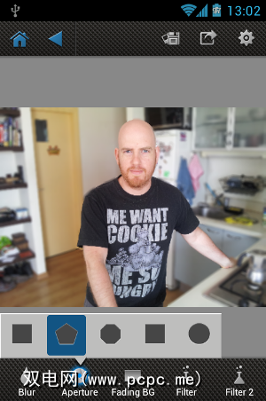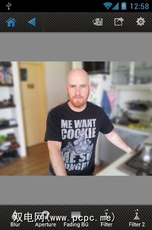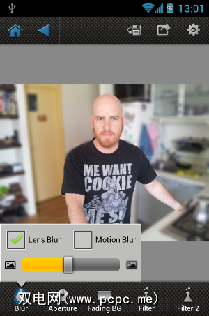 AfterFocus立即应用背景模糊效果,甚至对我智能手机的屏幕,我看到它还有很多不足之处。尽管如此,让我们继续前进,应用一些效果,然后看看我们得到了什么。底部的工具栏使您可以控制应用于背景的模糊量: