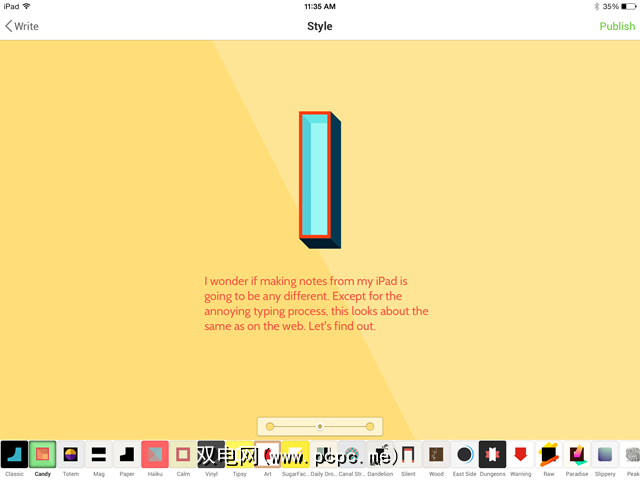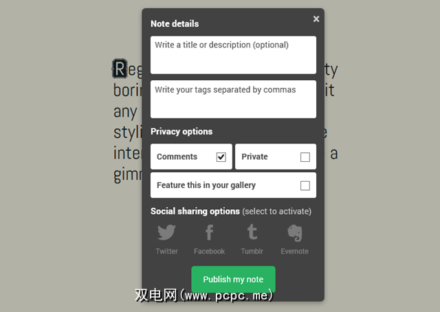 这可能会花费您一段时间,但一旦您适应了您喜欢的设计可以做几件事。点击“发布"按钮,然后选择您要将此笔记发送到的位置。您可以一路将其设为私有,在这种情况下,您只能看到它;您只能在Notegraphy上发布它;或者您可以在各种社交网络上共享它。