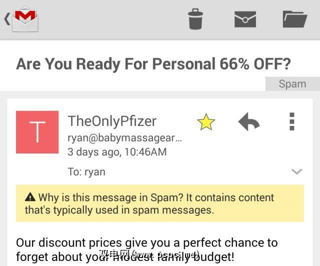 每当您在新的Gmail应用程序中浏览垃圾邮件文件夹时,您都会看到一条简短的注释,确切地说明了为什么该邮件最终被标记为垃圾邮件。