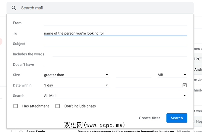 类似于Google,Gmail可以识别高级搜索运算符。在主搜索栏中输入 to:bob ,以查找您发送给名为Bob的所有人的所有电子邮件。