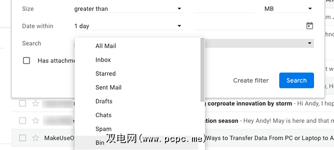 最后,将注意力转移到框底部的搜索选项。默认情况下,它设置为搜索您所有的电子邮件。如果范围太广,请将其更改为仅搜索过滤到特定收件箱或分配了特定标签的邮件。