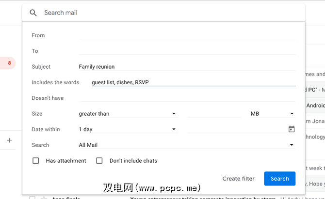 返回Google的搜索栏,并显示其他搜索选项。其中一个框允许按主题搜索。您会从前面的技巧中回想起,还可以在邮件中搜索某些单词。在包含单词框中输入一些相关的单词,如聚会,聚会,活动等,并以逗号分隔。