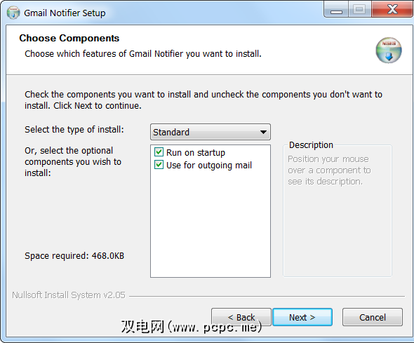 Gmail通知程序是一个只有几个选项的简单程序。安装时,系统会询问您是否要在启动时运行它,以及是否要使用Gmail来发送邮件。默认情况下,这两个选项均处于选中状态,您可能要同时启用这两个选项– 在启动时运行选项可确保Gmail通知程序一直运行,并监视您的帐户中是否有新电子邮件,尽管用于外发邮件选项使Gmail接管每个应用程序中的 mailto:链接-每当您单击Windows程序中的电子邮件链接时,Gmail通知程序都会启动一个Gmail撰写窗口。