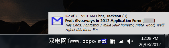 应用程序本身很简单。 Gmail通知程序将出现在系统托盘中,每隔几分钟就会检查一次新邮件。找到新邮件时,该图标将变为粗体,并且会为每个新电子邮件显示预览弹出窗口。