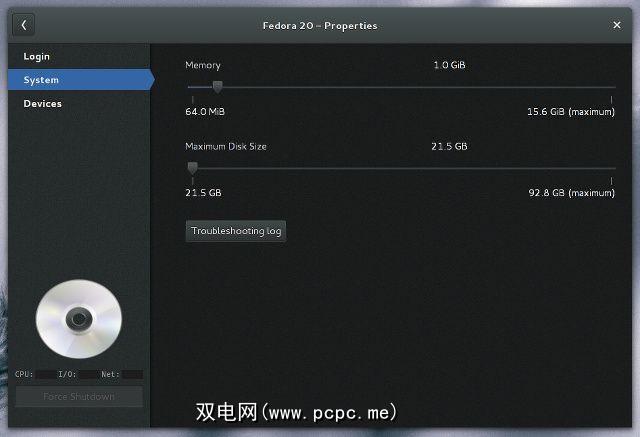 Before finishing off the wizard, you can customize how much RAM and disk space by clicking on the “Customize” button. Here, you can move around sliders to give or less of each. You may also notice a few categories along the left side of the window. These are Login, System, and Devices, where you’re currently in System. Choosing Login or Devices will only give you a little bit of information and nothing to configure – I expect this to change over the course of time.