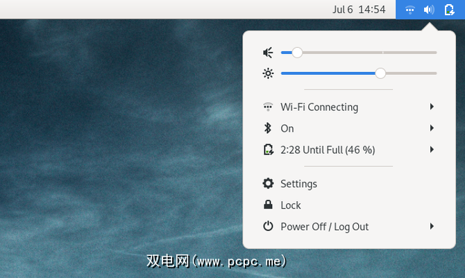 系统图标和通知显示在右上角。它们与默认GNOME中显示的相同。无论您单击哪个图标,它们都会打开相同的菜单,提供对可用Wi-Fi网络的访问,声音,电源管理,系统设置以及注销或关机的功能。