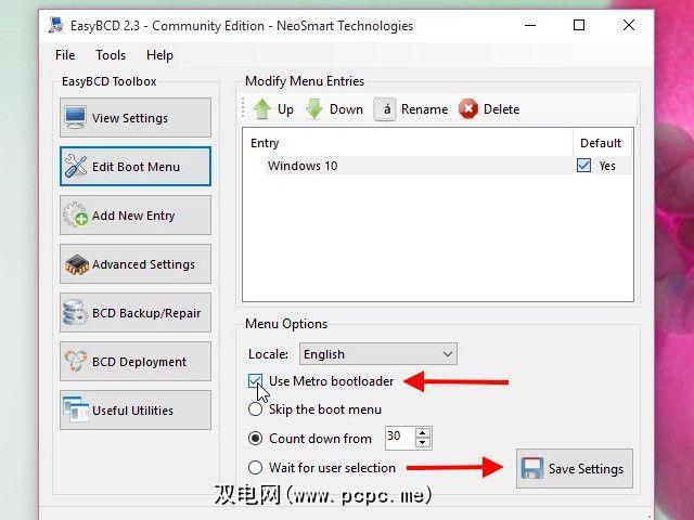 安装最新版本(在撰写本文时为2.3),启动程序,然后导航至编辑启动菜单 >在侧栏中。取消选中使用Metro bootloader 的框,然后点击“保存设置"按钮。